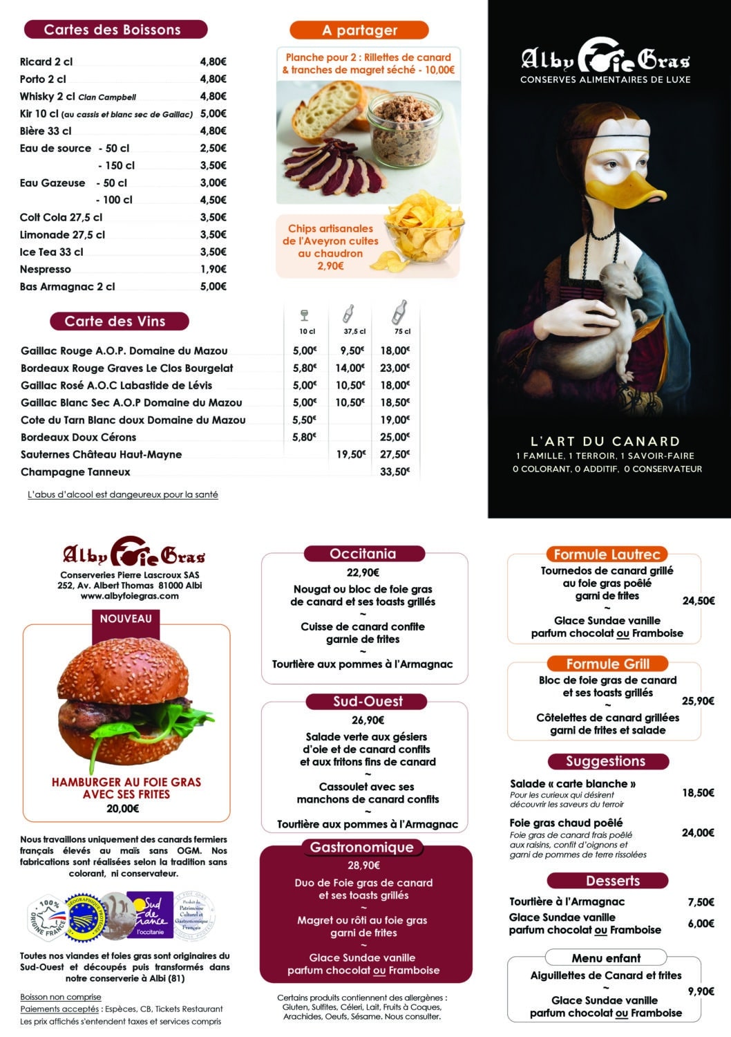 Nos viandes et foies gras sont originaires du Sud-Ouest et découpés dans notre conserverie à Albi (81)
